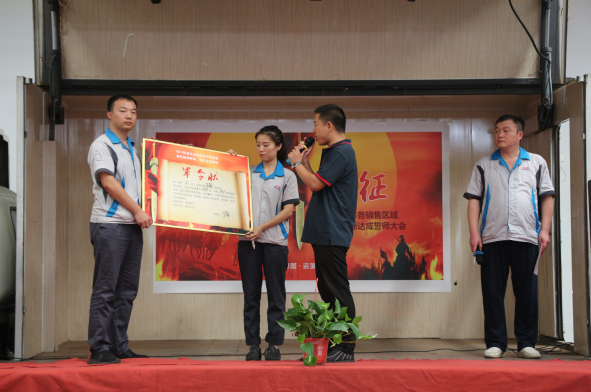 接著,市場(chǎng)處經(jīng)理鄧力對(duì)公司9月份的任務(wù)量及目標(biāo)進(jìn)行了宣讀,將目標(biāo)任務(wù)逐層進(jìn)行分解,讓每一位銷(xiāo)售精英們做到心中有數(shù),奮力拼搏。之后,本次活動(dòng)最為核心的環(huán)節(jié)——營(yíng)銷(xiāo)精英誓師,在市場(chǎng)處市場(chǎng)管理科主管吳曉旭激情昂揚(yáng)地帶動(dòng)下隆重開(kāi)啟,吳主管組織各大區(qū)經(jīng)理逐個(gè)上臺(tái),面對(duì)現(xiàn)場(chǎng)全體干部員工,激情而又莊嚴(yán)地宣讀了9月份銷(xiāo)量目標(biāo)軍令狀,并鄭重地按下手印,承諾:奮戰(zhàn)30天,使命必達(dá)!宣誓完畢后,公司領(lǐng)導(dǎo)為營(yíng)銷(xiāo)精英們披綬帶,戴紅花,握手祝福,殷切預(yù)祝他們9月份旗開(kāi)得勝、馬到功成,達(dá)成宣誓目標(biāo)。